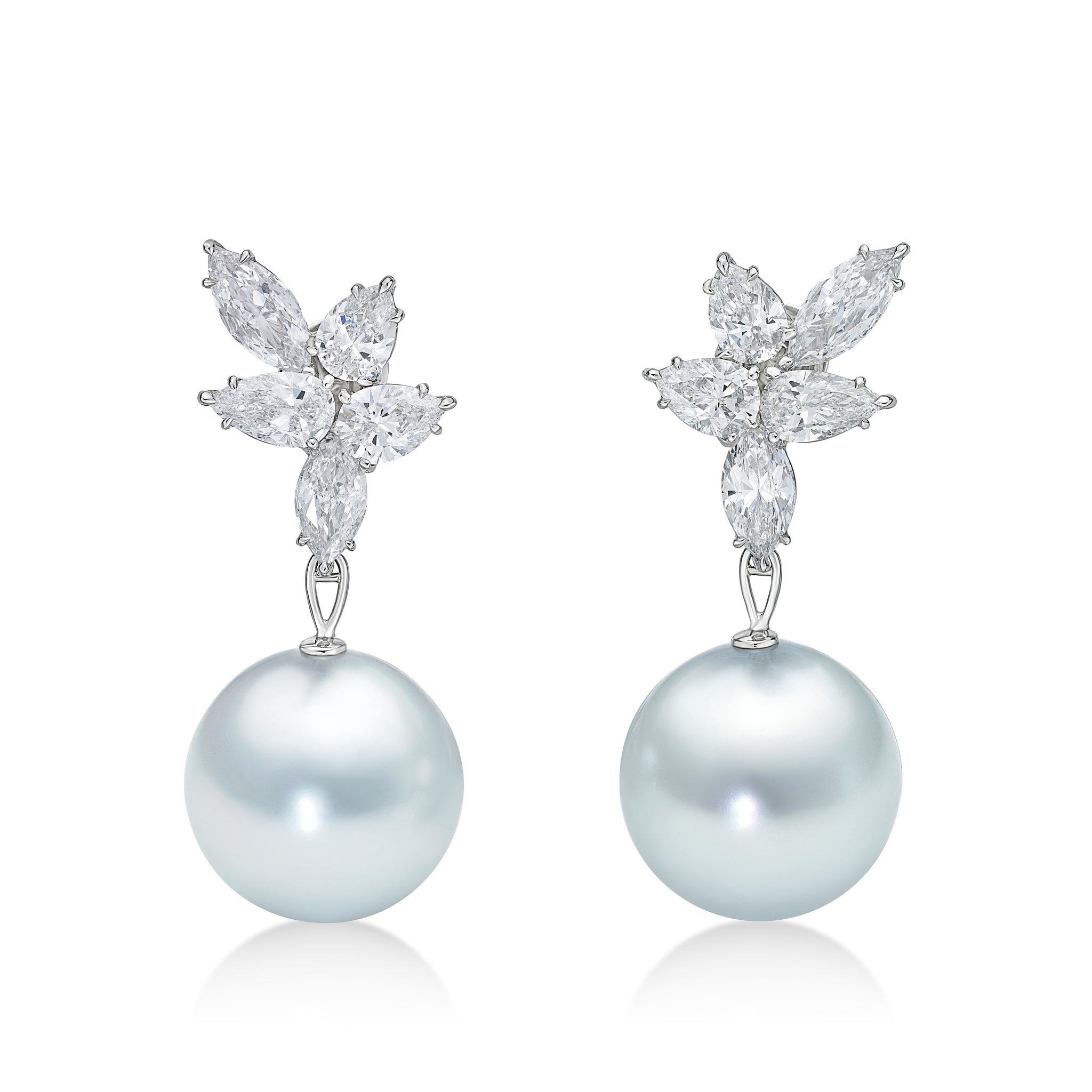 At the heart of each earring hangs a magnificent, perfectly spherical South Sea pearl, selected for its exceptional size, silvery-white luster, and flawless surface. The pearl’s soft, iridescent glow evokes the calm of a moonlit ocean, its smooth curves catching light to reveal subtle undertones of cool blue and silver.